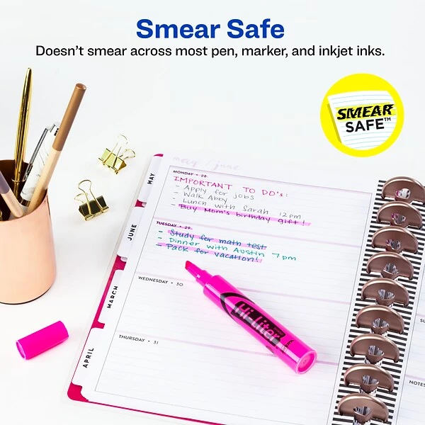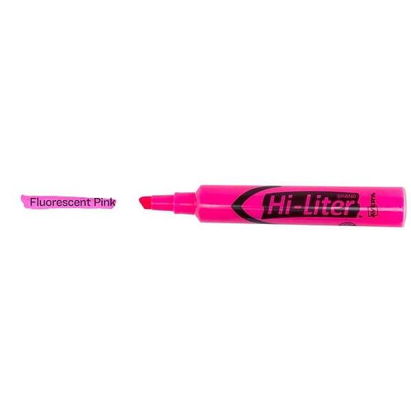 Prepare notes, research materials or index cards with these desk-style highlighters. The nontoxic ink is ideal for use in both offices and classrooms, while the fluorescent pink color stands out for better visibility. These Avery Hi-Liter chisel-tip highlighters resist smearing and smudging to keep papers clean.
