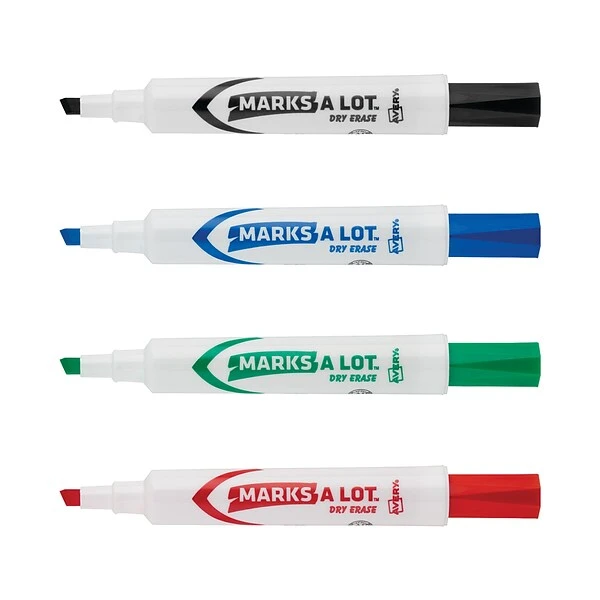 Mark up and cleanly erase with these Avery Marks-A-Lot dry-erase markers. The pens work great on whiteboards, glass and other nonporous surfaces and are certified nontoxic and low odor, making them ideal for use in office and classroom settings. These Avery Marks-A-Lot dry-erase markers have a chisel tip for dense and fine writing and come in four colors, letting you make dynamic presentations.