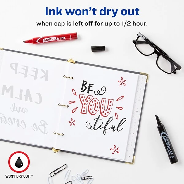 Create a lasting impression with this set of permanent markers. The low-odor ink makes the markers ideal for use indoors or out and is quick-drying to keep writing from smudging accidentally and cannot be washed away with water. Create fine or thick lines with the chisel tip. This set of Marks-A-Lot markers includes 20 black markers and four red markers to let you create easy-to-read marks when needed.