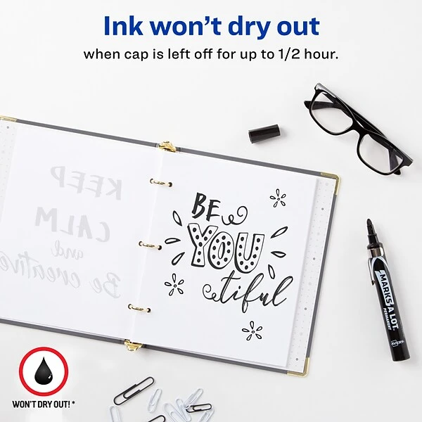 - Avery permanent markers won’t become dried out for up to half an hour without a cap