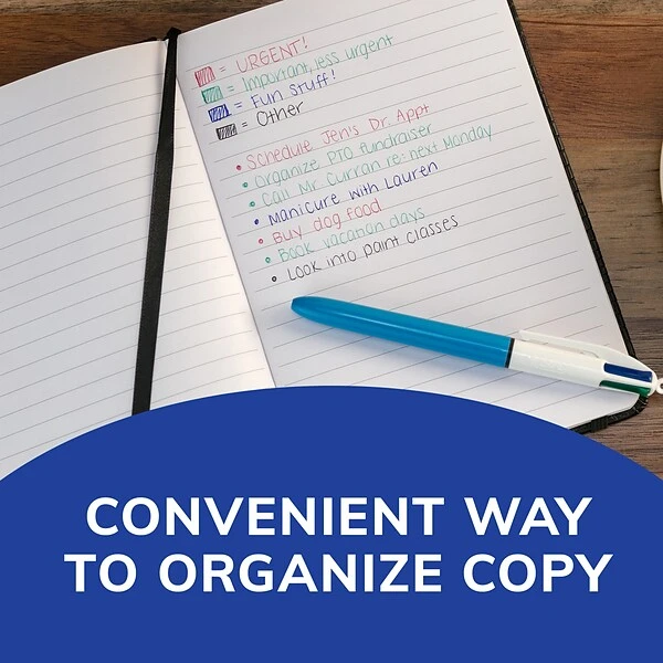 With four colors in one pen, you can enjoy an endless stream of multi-color uses. Add illustrations to your writing, or color code your written work for easier identification of important sections. These pens are great for note taking at school. They’re fun for all ages and can be used to write recipes, jot down notes, record detailed instructions or simply doodle. Each pen provides multiple color choices conveniently, requiring a simple click to instantly change from one color to the next.