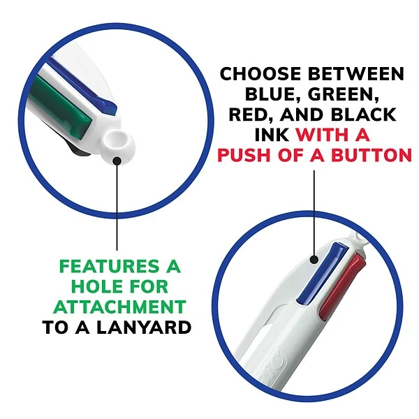 - Each pen writes in black, red, green and blue ink colors for greater versatility