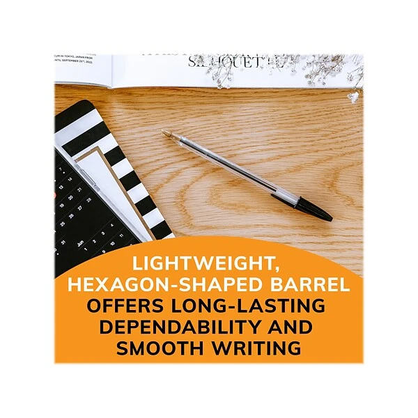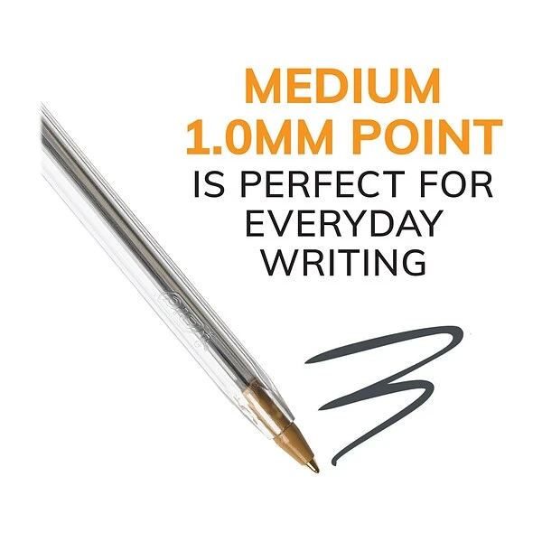 Combine exceptional performance and longevity with the BIC Cristal Xtra Smooth black ballpoint pen. The flexible 1.0 mm medium-point pen delivers crisp, legible lines, making this pen a superb choice for everyday writing activities. The pen minimizes blotting and skipping as the tungsten carbide ball helps the black ink spread evenly. The BIC Cristal Xtra Smooth pen has a snug, comfortable grip and a translucent hexagonal barrel that lets you see how much ink remains. The matching cap includes a handy clip for easy attachment to pockets or notebooks.