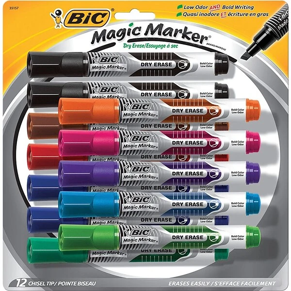 BIC Intensity Advanced Dry Erase Markers deliver both low odor AND bold writing. With their long-lasting supply of liquid ink, these tank-style markers provide smooth, consistent ink flow on whiteboards, glass, and most non-porous surfaces. These non-toxic markers also offer a visible ink supply, so you can easily check if you’re running low. The versatile chisel tip helps you switch seamlessly between bold, broad strokes and fine lines, and marks erase easily with a tissue or cloth. Available in a variety of bright, vivid colors, these dry erase markers are a great choice for home, school, or the office.