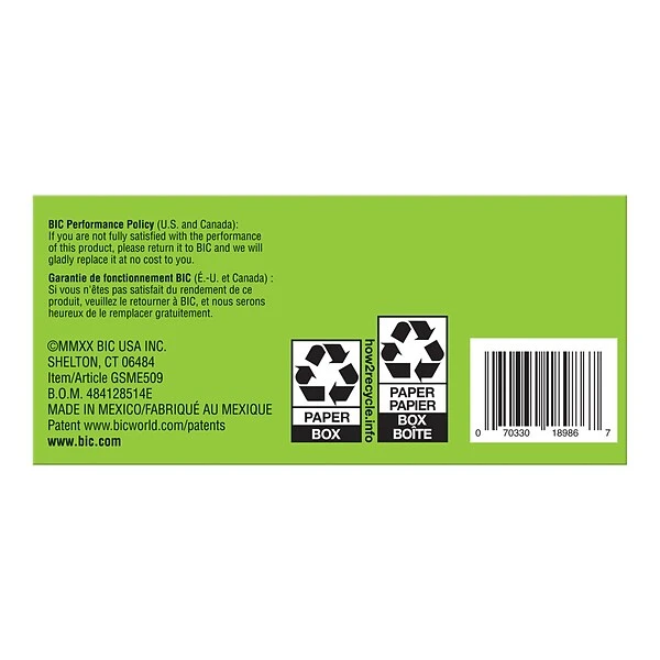 Join the ReVolution and help write our planet’s future with the long-lasting BIC ReVolution Round Stic ballpoint pen. Made of 74% recycled plastic, this sustainable pen writes 90% longer than PaperMate® InkJoy® 100 Stick Ball pen.* The paperboard used in this packaging is made up of 100% recycled content. This recycled pen has a multipurpose medium 1.0 mm ballpoint that makes it the perfect everyday writing pen as school supplies for notes, doodle and drawing. A smooth-flow ink system delivers hours of effortless writing. The sleek semi-clear barrel is not only nice to look at, but also a handy window for checking ink levels. *PaperMate® and InkJoy® are trademarks of Newell or an affiliate. Newell has not sponsored or approved and is not affiliated with this BIC branded product.