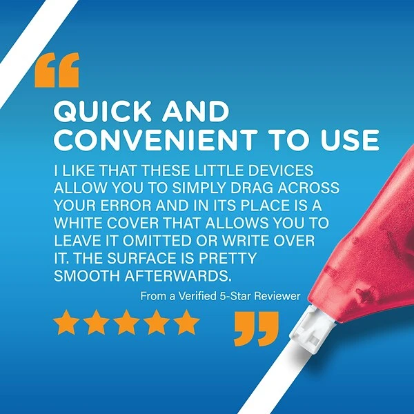 Quickly correct typed or handwritten documents with BIC White-Out Brand EZ Correct Correction Tape. Made by America’s #1 Correction Brand*, this correction tape goes on dry, allowing you to make instant corrections with no mess and no waiting time unlike the correction fluid white out liquid. Dispensing the tape is easy: simply hold the dispenser with your thumb in the groove, position the tip flat on your paper, press down firmly, and gently move from left to right. Offering greater strength than paper-based tape, this film-based correction tape is more tear resistant to create tidy, inconspicuous corrections that last. The self-winding mechanism helps prevent the tape from loosening, so you can apply the tape smoothly and accurately. And thanks to its translucent body, the dispenser lets you see how much tape is remaining.