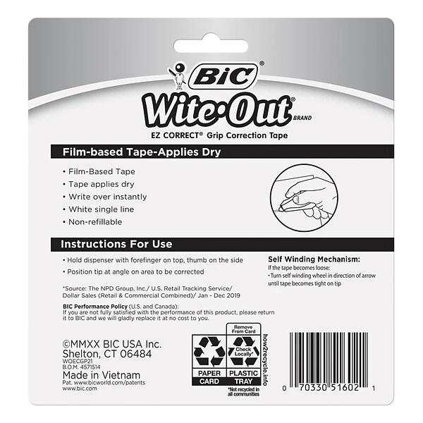 Designed for easier control, each roll of BIC Wite-Out correction tape is wrapped with a soft, contoured rubber grip that helps to reduce strain during prolonged use. This soft comfort grip makes Wite-Out tape a great choice for extended projects with multiple errors.