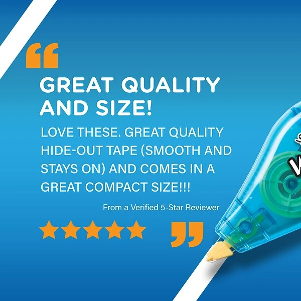Wite-Out Mini is a compact correction tape suitable for lefties and righties. The tape applies dry, so you can write over it instantly. Translucent dispenser lets you see how much tape remains. Wite-Out Mini offers approximately 26.2 feet of white correction tape per dispenser.