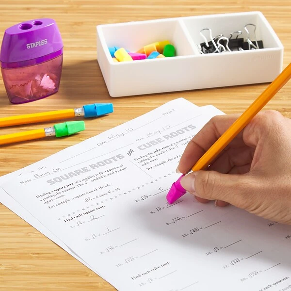 Top off pencils with these cap erasers. The unique design slots easily onto wooden-case pencils with standard diameters, making it easy to erase mistakes and typos quickly and efficiently, while the angled top allows the ability to erase mistakes on tight or awkward spots on the paper. These Staples cap erasers get rid of mistakes without leaving behind smudges, helping ensure clean, mark-free documents.