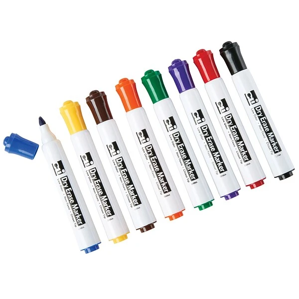 Barrel style dry erase markers feature low odor and bright vivid colors. Use on dry erase boards or glass. Markers wipe away clean and easily. Features a chisel tip and is non-toxic. Assorted colors include: red, blue, green, black, yellow, brown, orange and purple. AP Certified, conforms to ASTM D-4239