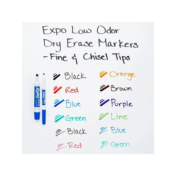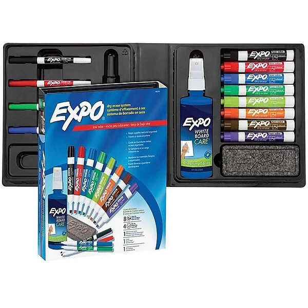 Create bright, colorful messages to students or colleagues with this EXPO low-odor dry-erase kit. Four fine-tip and eight chisel-tip markers in an array of colors let you create bold or precise lines, while the eraser and cleaning solution keep whiteboards sparkling clean. This EXPO low-odor dry-erase kit comes with a convenient carrying case, storing all your writing tools in one convenient place.