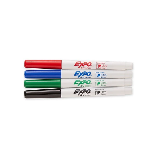 Print your ideas in confidence with the consistent, skip-free marking that these markers provide. The ultra-fine tip on these markers allows for detailed writing, while the quick-drying ink minimizes smudging. At the same time, the low-odor formula reduces making the smell, making the markers ideal for an office environment. Expo dry-erase markers also make for easy clean up, wiping away with a cloth or eraser.