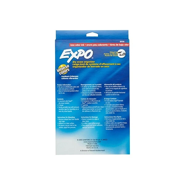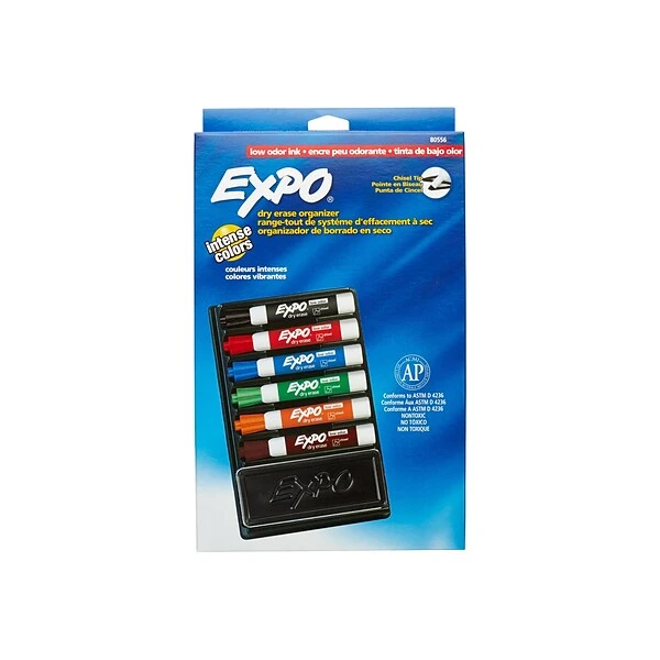 Outfit your conference room or classroom with this EXPO dry-erase organizer kit. Six assorted color dry-erase markers let you color-code thoughts and ideas, while the chisel tips deliver broad strokes or fine lines. The marker organizer comes with a self-adhesive strip, making it easy to mount on whiteboards or walls. Featuring a handy eraser, this EXPO dry-erase organizer kit lets you wipe away your notes at the end of each meeting or lecture.