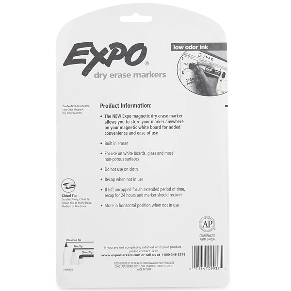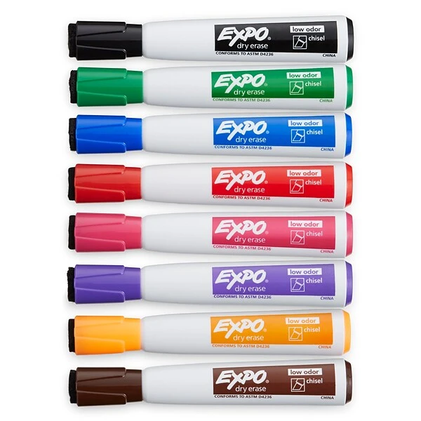 Brainstorm new concepts with your team and these Expo dry-erase markers. The bold pens come in a pack of eight assorted colors, so it’s easy to list ideas or notate diagrams clearly, and the low odor makes these markers ideal for closed areas such as classrooms and offices. Chisel tips on these quick-drying Expo dry-erase markers let you write with broad, medium and fine lines.