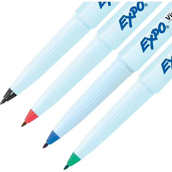 Enhance overhead writing with these Vis-Ã -Vis wet-erase markers that come in four distinct colors: red, green, blue and black. These ?quick-drying markers feature fine points and a water-based ink that allows for easy clean-up with a damp cloth. These Expo Vis-a-Vis assorted wet-erase markers work on nearly any non-porous surface and are ideal for use in offices and classrooms.
