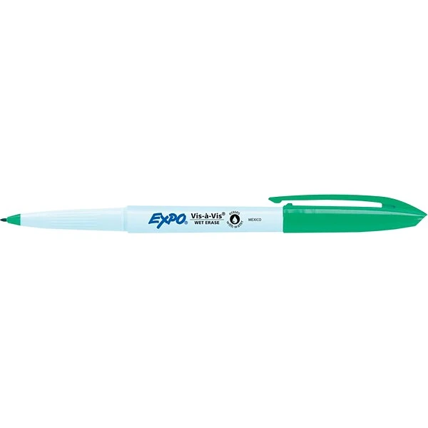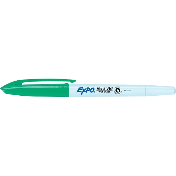 Lead classroom lectures or business meetings with these Expo Vis-a-Vis wet-erase markers. The wet-erase format is ideal for use on transparencies and overhead projectors, and the bright green ink lets you underscore important ideas in a different color. To remove the ink, simply wipe it away with a damp cloth. These Expo Vis-a-Vis wet-erase markers feature fine-point tips, providing precise lines for detailed notes or math equations.