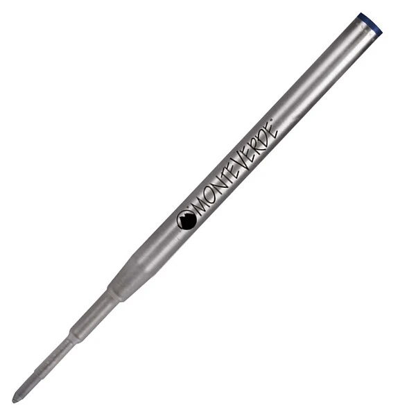 Monteverde® Soft roll™ Ballpoint refill in blue/black for Montblanc® ballpoint pens features low viscosity ink for easy flow and has a large capacity metal body. Refill bears a nickel plated brass tube and a broad point Swiss tip, sold as 6 per pack.