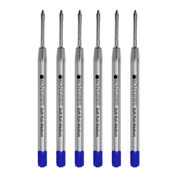 Monteverde® Soft roll™ Ballpoint refill in blue for Parker® ballpoint pens features low viscosity ink for easy flow and has a large capacity metal body. Refill bears a nickel plated brass tube and a medium point Swiss tip, sold as 6 per pack.