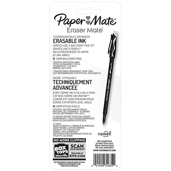 Enjoy the smooth, rich marks of a pen and the erasability of a pencil with Paper Mate EraserMate Erasable Pens. These erasable pens have rich ink that is formulated to wipe away cleanly and is pressurized to fluidly write at any angle. Each Paper Mate erasable pen has a precise yet bold 1.0mm medium point. There’s even an eraser on the cap of each erasable pen for quick erasing when you need it most, and a convenient clip to secure your erasable pen anywhere you need.