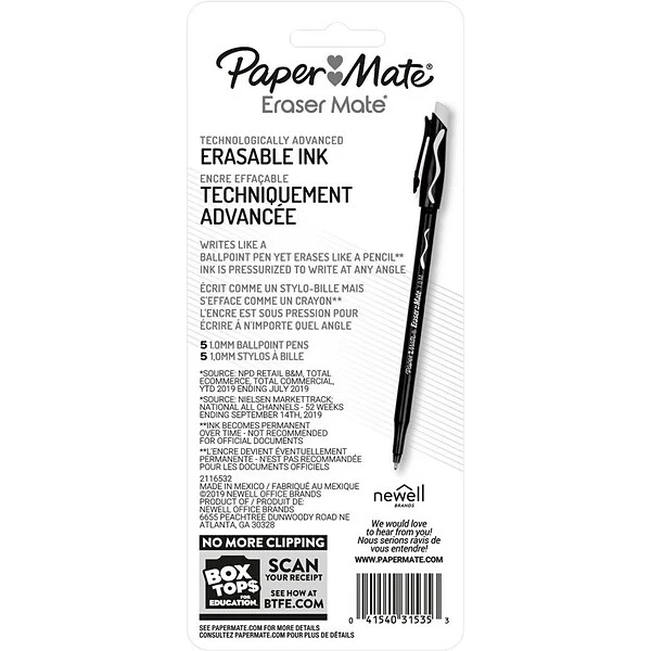 Write at any angle with the Paper Mate Erasermate Pen, which features pressurized ink. The erasable pens in this pack of five are topped with erasers to rub away the blue ink.