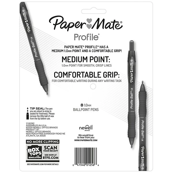 Make smooth, crisp lines with Paper Mate Profile ballpoint pens. These retractable pens now come in a 1.0mm tip, so you can write powerful lines that stand out on the page. Profile pens also include a soft grip for comfortable writing during any writing task.