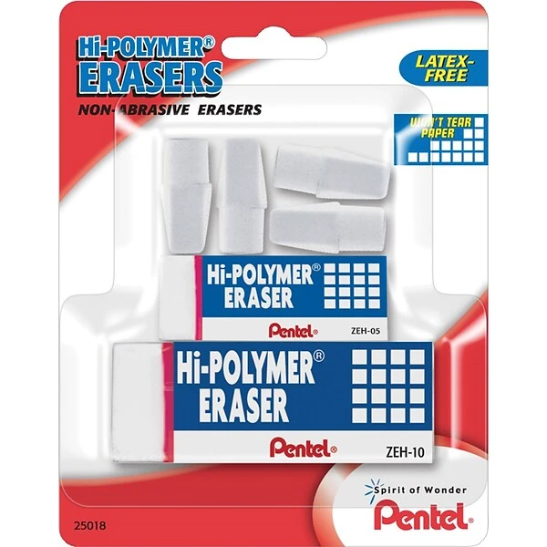 Pentel® Hi-Polymer® Eraser in assorted sizes helps to clear pencil marks in corners and cap fits into wooden case pencils. Latex-free eraser is made of high quality material and is sold as 6 per pack.