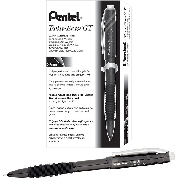 PentelĀ® Twist EraseĀ® GT Mechanical pencil with 0.7 mm medium point in black color features sliding sleeve to extend write-out that lowers lead breakage. Pencil has twist up eraser that results no smudges and no paper tear for better writing quality.