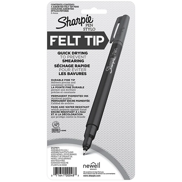 Set your creativity free with these Sharpie fine point pens. Each pack contains black, green, blue and red pens, letting you color-code your notes, deliver dynamic presentations or create brilliant artwork. The fine-point provides crisp, sharp lines, while the capped design helps prevent unwanted marks. These Sharpie fine-point pens are refillable so you can keep the ink flowing.