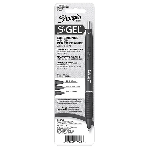 The power of Sharpie is now in a gel pen with the Sharpie S-Gel. With no smear, no bleed technology and bold, best-in-class ink, this Sharpie pen delivers always vivid writing. It is a high-performance gel pen with a sleek, professional look that makes it a writing instrument you won’t want to loan out. And the contoured rubber grip makes for comfortable writing during any task. Available in multiple point sizes, barrel finishes and gel ink colors, Sharpie S-Gel offers a smooth writing experience perfect for homes, schools, or offices.