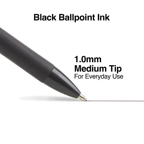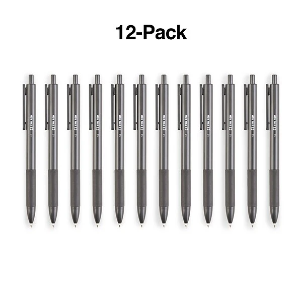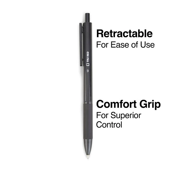 Write easy-to-read notes for members of your team with these retractable ballpoint pens. The 1.0mm tip delivers sharp, clear lines, while the low-viscosity ink offers a smooth writing experience. Featuring a retractable tip, these ballpoint pens help prevent accidental scribbles. These TRU RED black retractable ballpoint pens have clips for easy carrying and rubberized grips for comfortable holding.