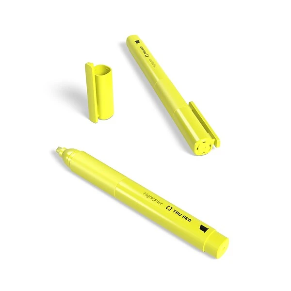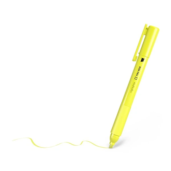Underline or fully mark text with this 5-pack of chisel-point highlighters. The yellow ink offers excellent visibility, and the bright-colored body and cap are easily identifiable. These TRU RED™ pocket-grip highlighters include an ergonomic rubber grip for added comfort while highlighting.