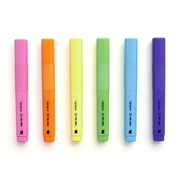Keep track of the best parts of any printed page with these tank highlighters. A rubber grip ensures markers stay firmly in hand, and six colors, including blue, yellow, orange, green, purple and pink, allow for color-coded highlighting. Chisel tips on these highlighters let you boldly cover entire words or simply underline important thoughts.