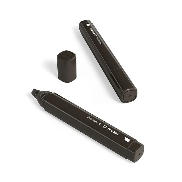Make sure important memos, labels, and other notes get noticed with these permanent markers. The black ink lets writing stand out boldly against various paper hues, while the chisel tips allow you to create thick and thin lines to make points clearer and for graphics. These TRU RED™ black permanent markers come with five per pack, so you can put one at every workstation or counter.
