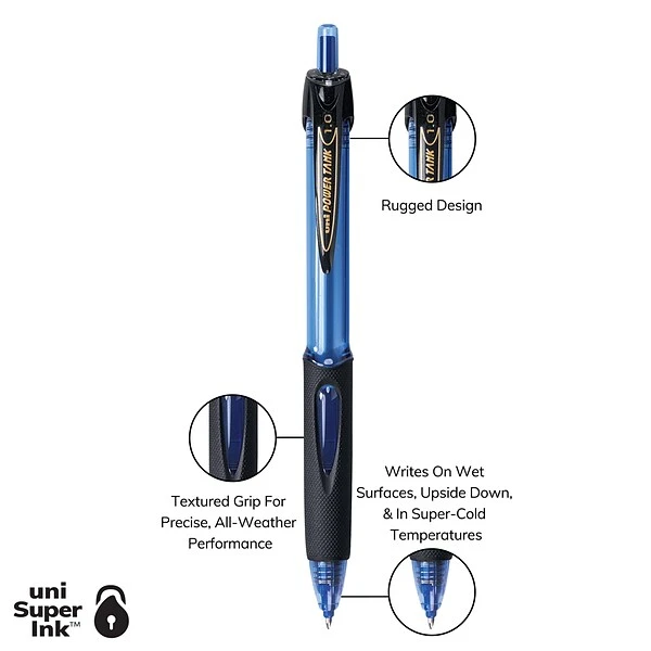 Write effectively in the toughest conditions with Power Tank Retractable Ballpoint Pens from uniball featuring a 1.0mm medium point. Designed to perform optimally in extreme conditions, the pens feature a pressurized ink cartridge that offers fast and clean writing even on damp surfaces, in bitterly cold conditions or at unusual angles, including upside down. The refillable ballpoint pens come with a textured rubber grip that encourages greater writing comfort. uni Super Inkâ„¢ has pigmented particles that create an Incredible bond with the paper, helping you create fraud, fade and water resistant documents even in harsh environments. The 1.0mm medium point offers bold strokes with a rich color payoff for clear writing. When you need a rugged writing tool, this refillable ballpoint click pen is the best choice in any hemisphere.