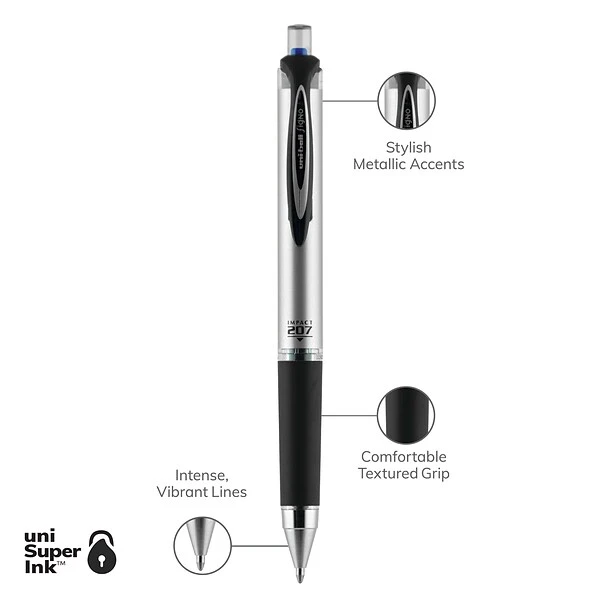 Make an impact with 207 IMPACT RT Gel Pens from uniball featuring a 1.0mm bold point with a stainless steel tip that resists bending and breaking. Even-flowing, pigment-based gel ink renders an outstanding ink laydown for a smooth writing experience and strikingly bold lines. Use these retractable gel pens for everyday writing tasks, check signing and all of your important signatures, trusting its quick-drying uni Super Ink. Exclusive uni Super Ink technology entrenches the gel ink deep into the paper, preventing document alteration, water damage or fading. The 1.0mm point delivers bold writing with a silky finish. A soft rubber grip helps you continue writing without fatigue while maintaining precision and detail throughout your tasks – and when your writing is complete, the innovative clip auto retracts the tip, protecting against unwanted gel ink marks and stains. Lend a vivid touch to your writing with these sophisticated retractable gel pens that glide smoothly for distinct and neat writing.