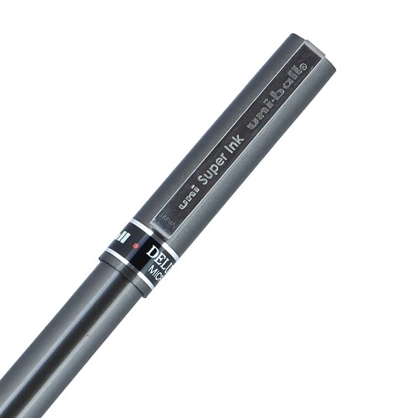 Introduce sophisticated style to your everyday writing with Deluxe Rollerball Stick Pens from uniball featuring a strong, long lasting 0.5mm micro tip. Even-flowing, acid-free liquid ink delivers a smooth writing experience for intense, vibrant lines. Micro point pens produce neat and crisp strokes for intricate writing, making it easy to create super fine details in your drawings and diagrams. Capped roller pens are useful for a variety of tasks from note taking and list making to signing checks and legal documents. Innovative uni Super Ink technology forms a strong bond with the paper, protecting from water, fading and fraud. Up your writing instrument sophistication with the matte black, brushed steel barrel of the Deluxe capped rollerball pens.