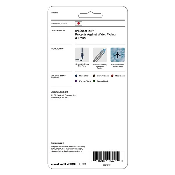 Give your writing a boldy infused flavor with Vision Elite BLX Rollerball Pens from uniball featuring a bend-resistant stainless steel 0.5mm micro tip and tungsten carbide rollerball. Capped roller pens deliver smooth, intense lines with unparalleled definition – useful for note taking, list making, signing checks and legal documents, and even uniquely embellishing creative writing projects. Innovative uni Super Ink technology effectively entraps the gel ink into the paper, producing fraud, fade and water-resistant documents that resist check washing or bleaching. These Vision Elite pens have a special design that withstands cabin pressure variances without leaking, making them useful for travelers. Exclusive Uni-Flow Ink System ensures a consistent, delightfully fluid writing experience, and a translucent window ensures that you don’t run out of ink unexpectedly. These sleek and modern roller pens come in an assortment of black ink infused colors, adding an element of drama to your every day tasks and creative writing projects – no matter the altitude.