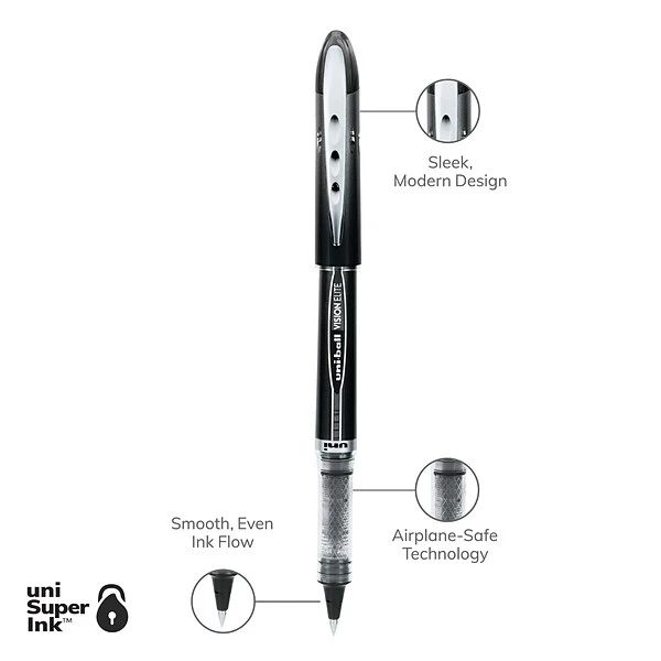Travel with peace of mind by using these uniball Vision Elite rollerball pens. Leak-resistant even through changes in cabin pressure, these pens let you keep on working, while the micro-point tip allows you to jot down your notes with crystal-clear writing. These uniball VISION ELITE rollerball pens are manufactured with archival-quality acid-free ink to help protect important documents.