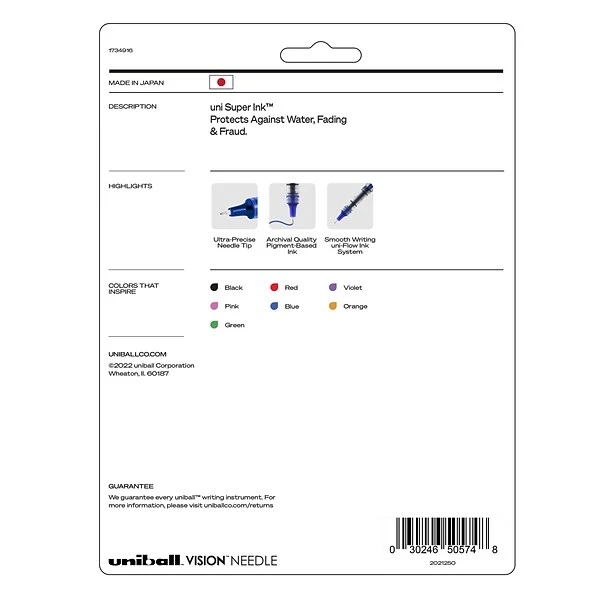 - 0.7 mm fine needle point fade-proof pens have uni Super Ink that makes them water and fraud-resistant