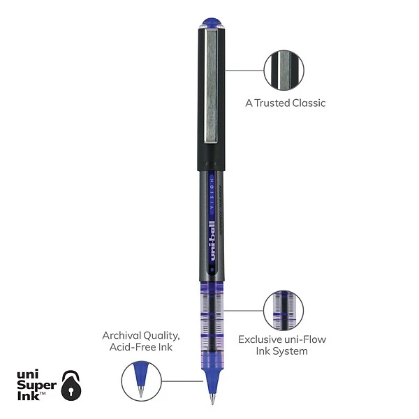 Make your everyday writing easy with the effortless and dependable performance of Vision Rollerball Pens from uniball available in multiple tip sizes. Capped roller pens deliver an even liquid ink lay-down for reliably smooth, vivid lines and a rich color for improved clarity and readability. Great for all writing tasks from taking notes to record keeping with archival quality, acid free roller ink. Innovative uni Super Ink technology forms an indestructible bond with the paper to minimize the risk of check washing or document fraud, while also protecting from water and fading. The exclusive Uni-Flow Ink System ensures a consistent, delightfully fluid writing experience, and a translucent window ensures that you don’t run out of ink unexpectedly. Enjoy beautiful clean lines and give all of your ideas a burst of brilliant color with this classic style rollerball pen.