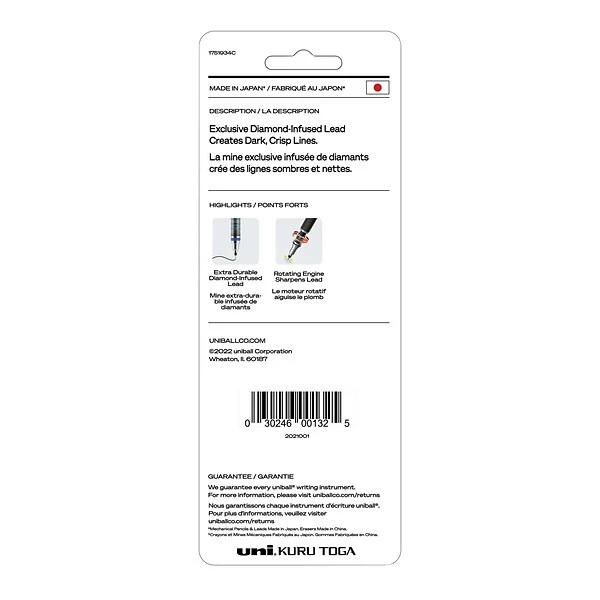 Each uni-ball® Kuru Toga Mechanical Pencil Set contains a mechanical pencil, 10 diamond-infused lead refills and two eraser refills. Kuru Toga mechanical pencils feature a unique, patented twist and turn mechanism that rotates lead as you write to keep lead sharp and resists breakage. This uni-ball® pencil can be refilled with any 0.5 mm lead.
