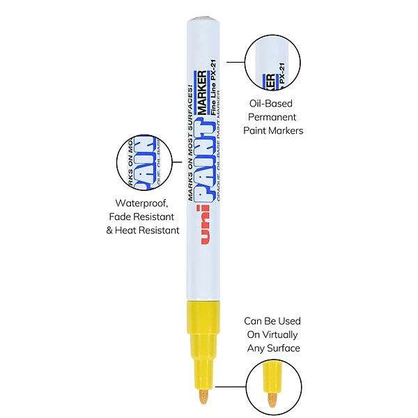 - Includes yellow uni Paint Oil-Based Paint Marker(s) with a fine line (1.2mm tip)
